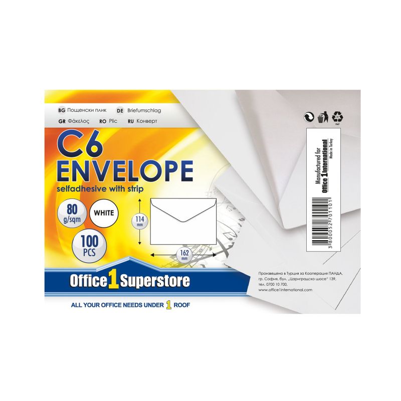 Office 1 Плик, C6, 114 x 162 mm, хартиен, със самозалепваща лента, бял, 100 броя