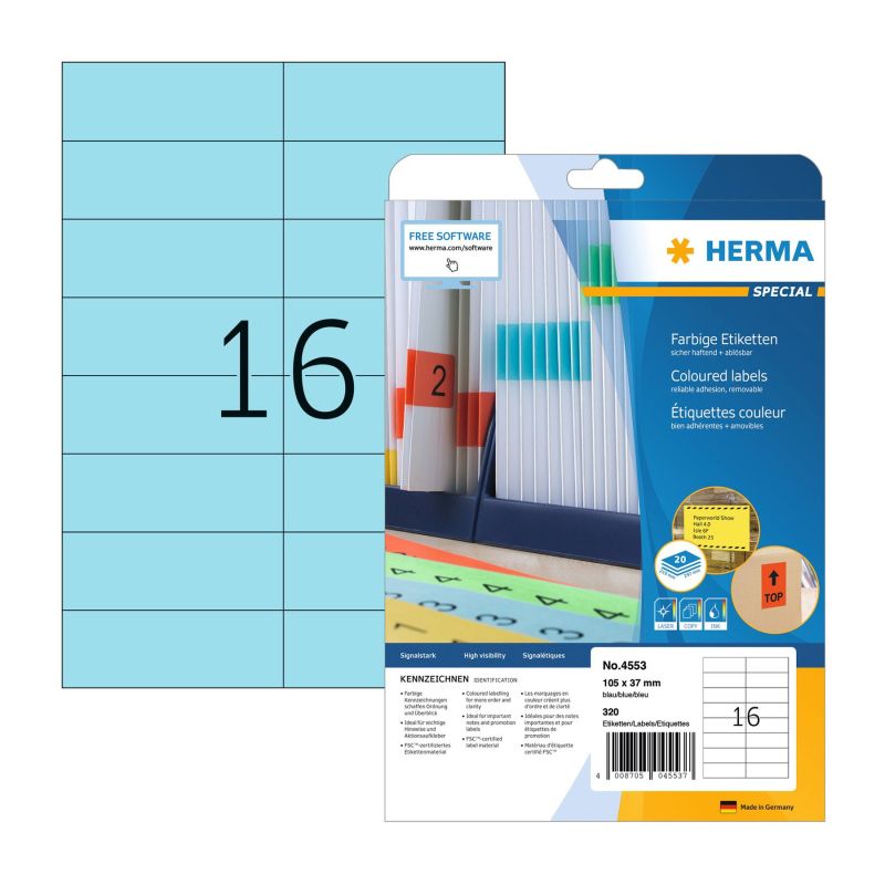 Herma Самозалепващи се етикети, A4, 105 х 37.1 mm, сини, 16 броя, 20 листа