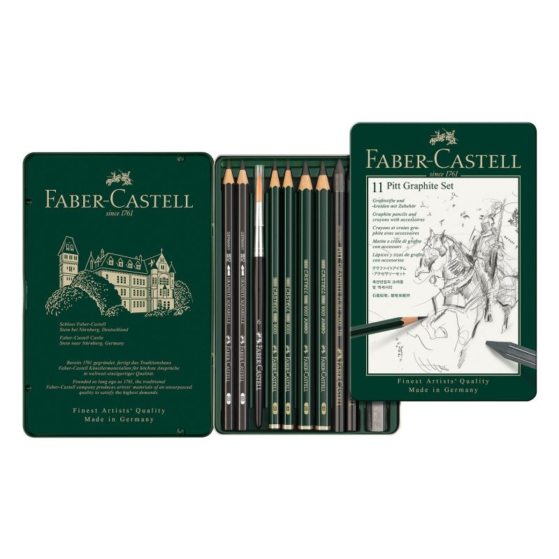 Комплектът съдържа: 2 бр. чернографитни моливи Castell 9000 (2B и 8B), 2 бр. чернографитни моливи Castell 9000 Jumbo (2B и 8B), 2 бр. чернографитни акварелни моливи (2B и 6B), 2 бр. чист графит в лак (3B и 6B), 1 бр. графит шестоъгълен пастел (6В), 1 бр. винилова гума и 1 бр. четка.