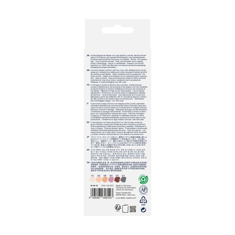 В комплекта ще откриете 6 маркера на алкохолна основа с два накрайника. Накрайникът е мек и гъвкав, проектиран с четка, подходяща за различни зони. Ширината на накрайника се променя, което прави маркерите чудесен избор за рисуване на контури и детайли. Всеки маркер е водоустойчив. Мастилото изсъхва бързо и предотвратява размазване. Цветовете лесно могат да се смесят. Произведени са от 100% рециклиран материал.