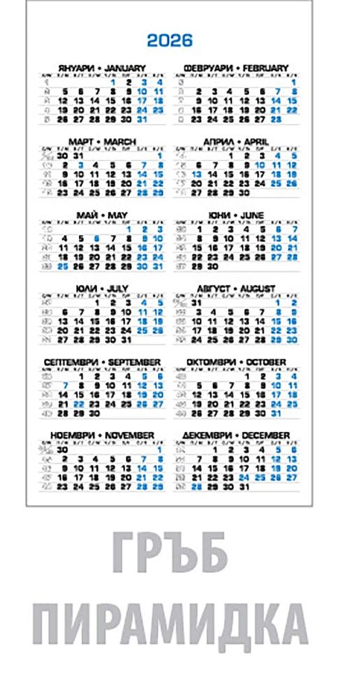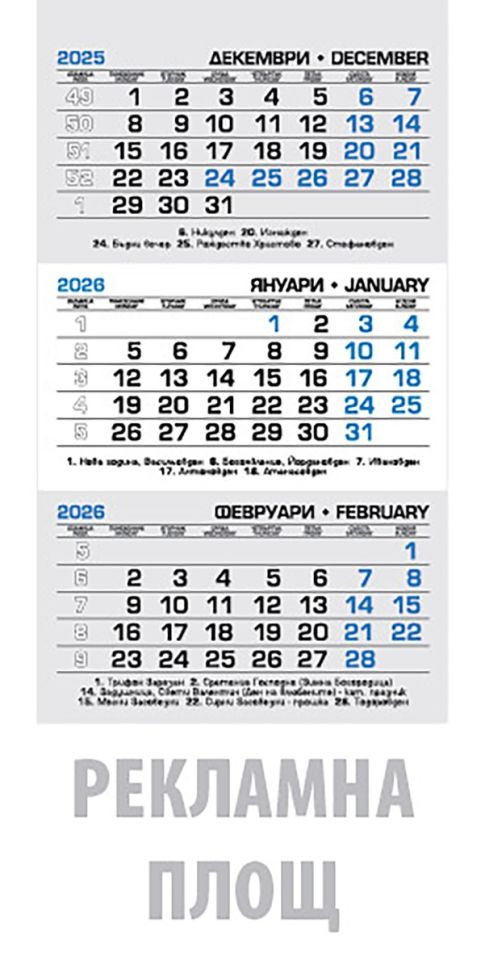 Тяло 8.5 х 15 cm. Офсет. Печат 2 цвята черен/червен или черен/син. 2 езика - BG/ ENПодложка: картон 250 g/m2, 10 х 20.5 mm. Календариум за 2025 на гърба.Рекламна площ 10 х 4.5 cm. Прозорче за отбелязване на текущата дата.