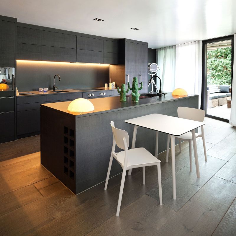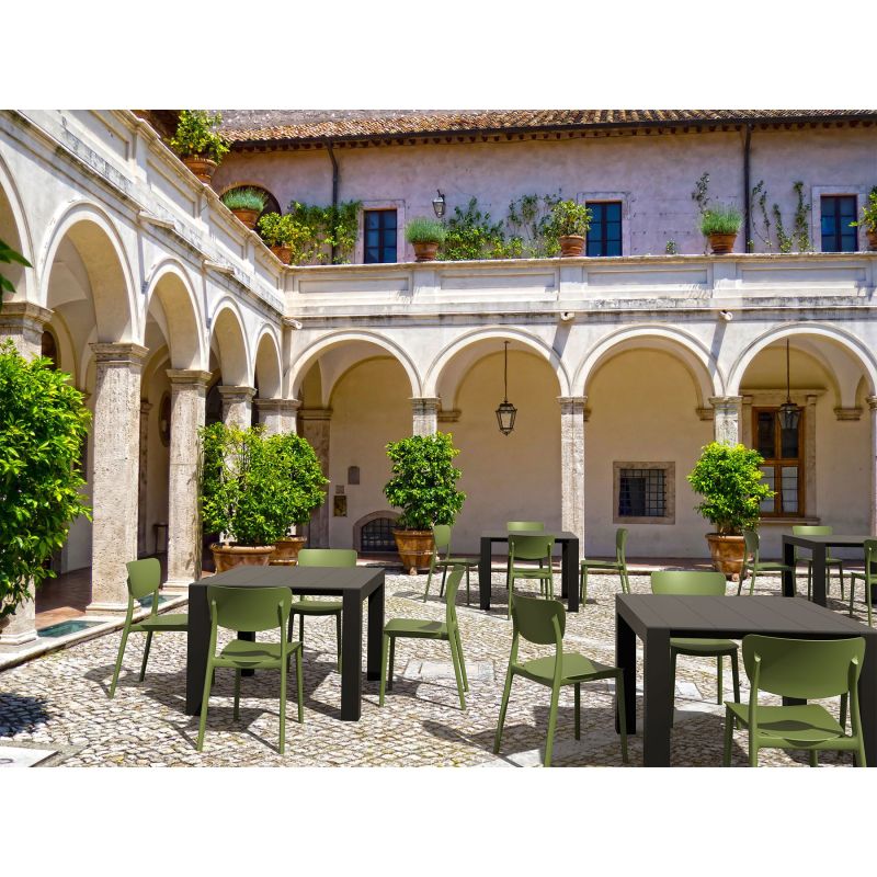 Стол Moon e подсилен със стъклени влакна, получени с помощта на най-ново поколение технология за въздушно формоване, а облегалката е в прозрачен поликарбонат.