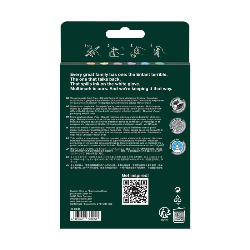Комплектът от акрилни маркери на Faber-Castell предлага пастелни тонове и отлично покривно действие върху различни повърхности.