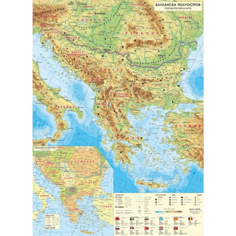 Стенна карта на Балканския полуостров, физическа, 100 x 140 cm