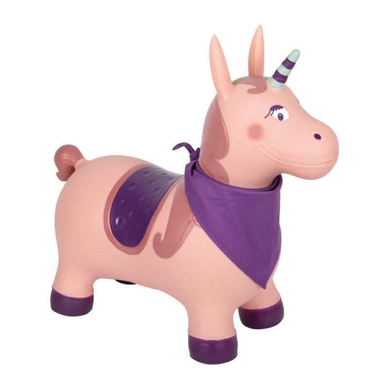 Това надуваемо еднорогче приканва към енергично подскачащо забавление у дома и навън. С удобни за хващане уши и рог и с включен шал, то предлага сигурно място за игра, която укрепва коремните мускули и баланса.