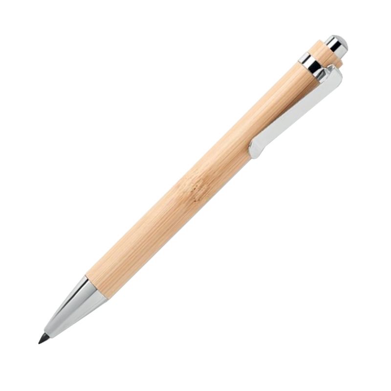Дълготрайна химикалка без мастило с бутон, бамбуков корпус и лъскави хромирани елементи.