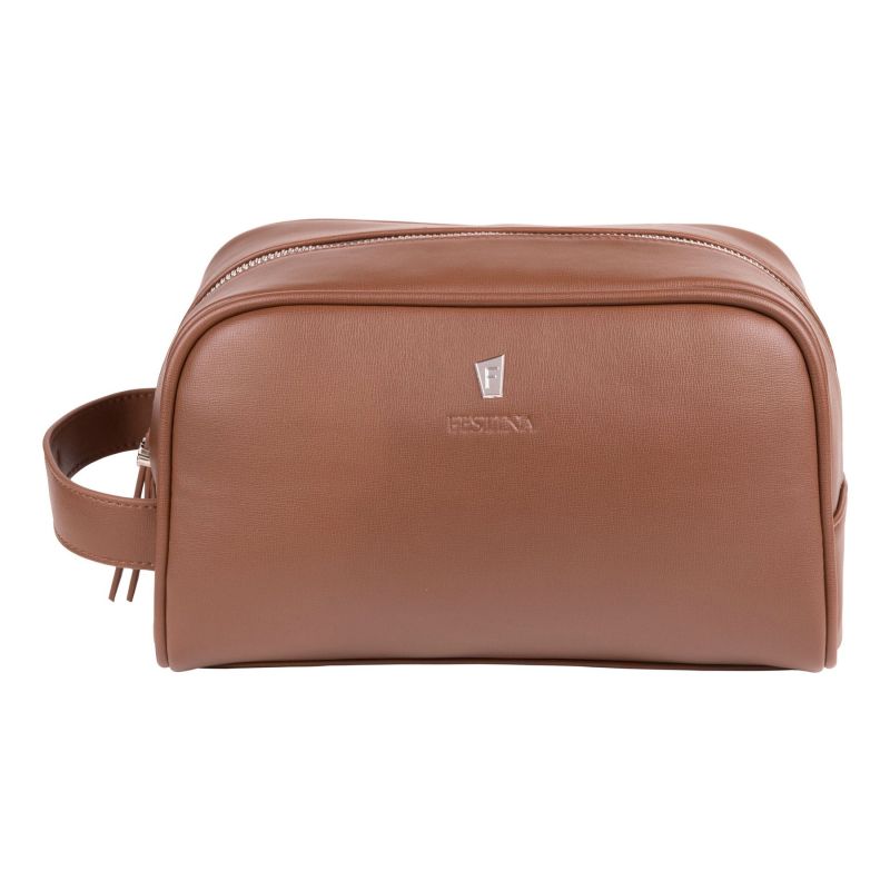 Тази козметична чантичка е лесна за пренасяне благодарение на дръжката с каишка, върху която също ще откриете логото на марката.