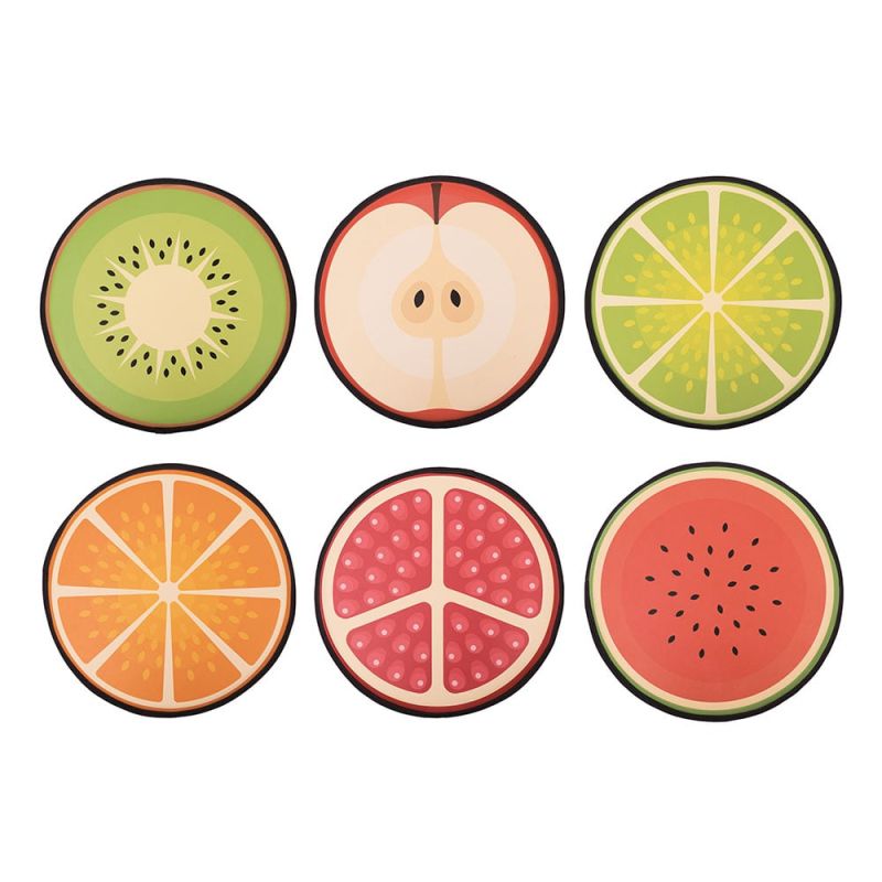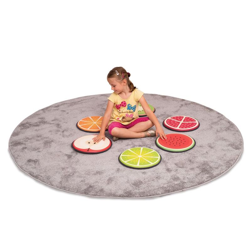 Формите са напълнени с пяна и покрити с лесен за почистване PVC материал. Освен, че служат като възглавнички, те могат да се използват в различни тематични занимания. Децата могат свободно да се преобръщат или играят върху тях, благодарение на противоплъзгащото се дъно.Комплектът се състои от: киви, портокал, лайм, диня, ябълка, нар.