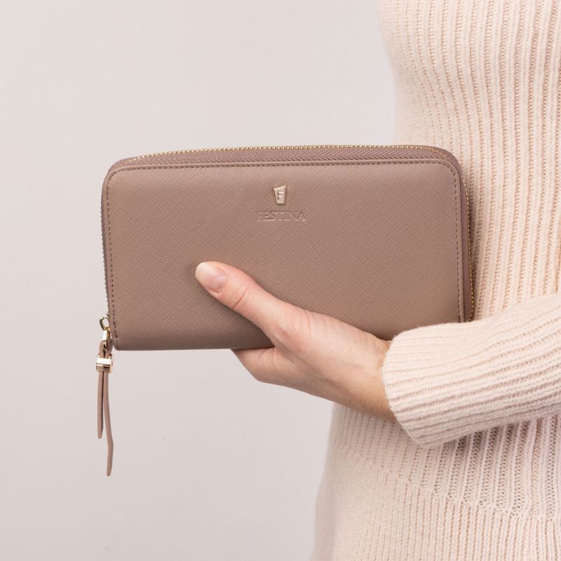 Вижте отблизо красотата на дамския портфейл "Mademoiselle", изработен от прекрасно текстурирана сафианова веган кожа. Всеки детайл е деликатно изработен, като механизмите на циповете, украсени с Festina Blazon, са вдъхновени от емблематичните за марката бутони за спиране на часовника. Този бежов модел има контрастен почти бял цвят на вътрешната част и се отличава с изключителна визия. Портфейлът е брандиран с фино релефен надпис на Festina, под златистата версия на луксозното "F".