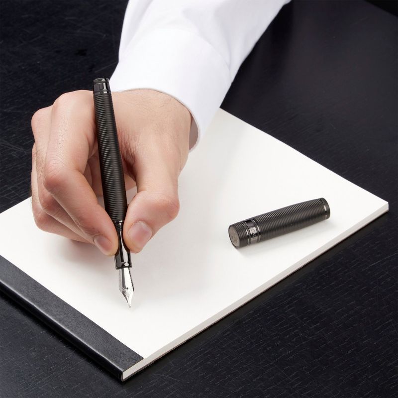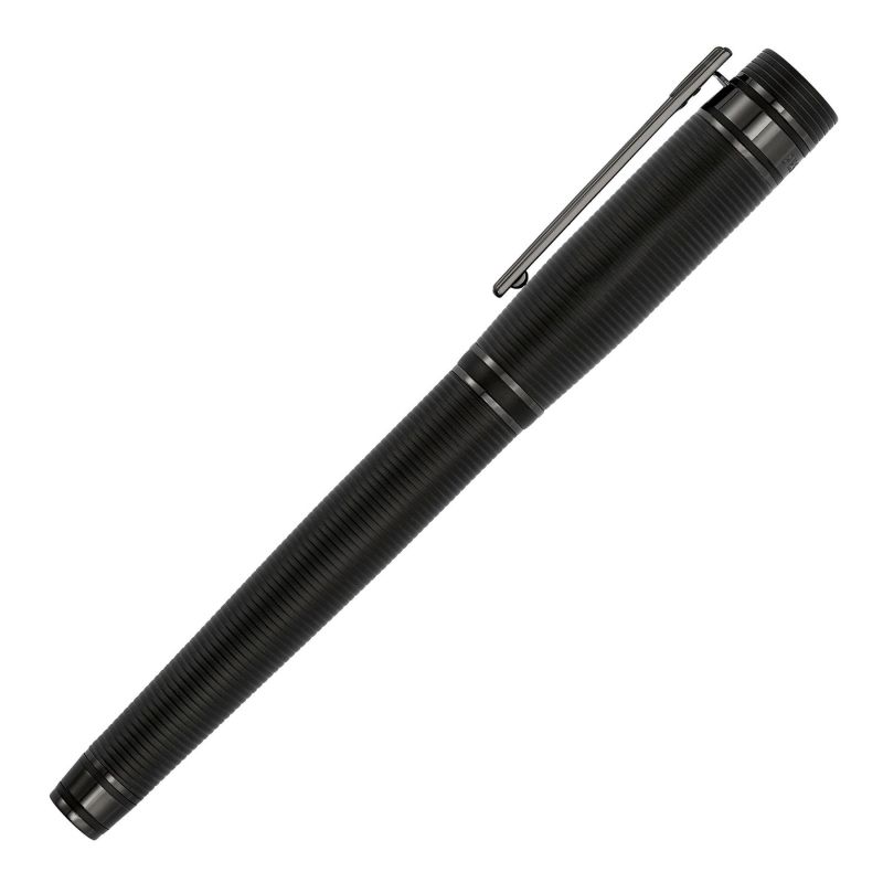 Писалката е гравирана с хоризонтални ивици с луксозно метално покритие и изискани детайли.