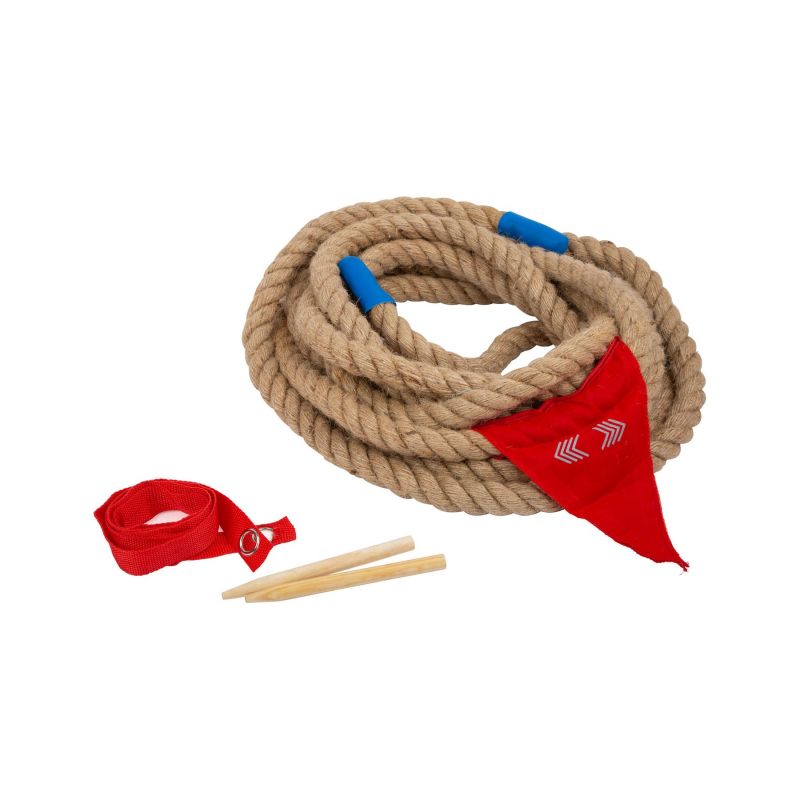 Класика сред игрите! С това здраво въже два отбора могат да измерят силата си! С много мотивация и екипен дух тестът за сила се решава лесно. Печели първият състезател, който изтегли червения флаг върху червените маркировки. Червените ивици могат да бъдат прикрепени към тревата с дървени пръти, след което лесно да бъдат премахнати. Пластмасовите капачки в краищата на въжето осигуряват дълъг експлоатационен живот.