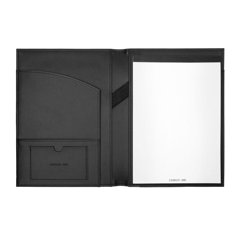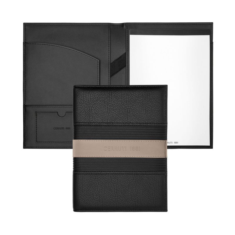 Представяме ви папка за писане CERRUTI 1881 Delano, изработена от веган кожа в класическо черно с контрастна бежова лента и голямо, фино релефно лого.