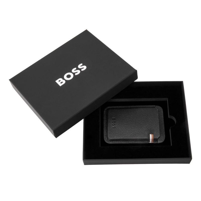 Тази версия Iconic се отличава с красива черна текстурирана кожа и е фино щампована с логото на BOSS. Завършващият щрих е подплата с монограм, която добавя още един фин елемент на марката. Друга отличителна черта на тази емблематична версия е трицветното текстилно знаме, което украсява всички артикули от тази серия.Калъфът събира до 5 карти.