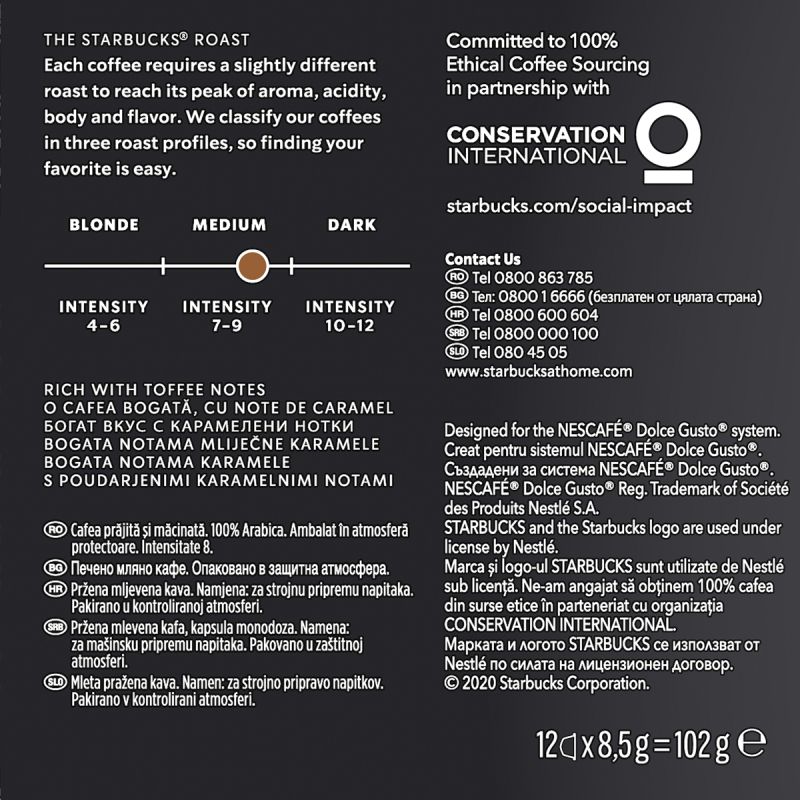 Кутията съдържа 12 кафе капсули STARBUCKS от NESCAFE® DOLCE GUSTO, създадени за кафемашини NESCAFE® DOLCE GUSTO, с които може да приготвите 12 напитки.