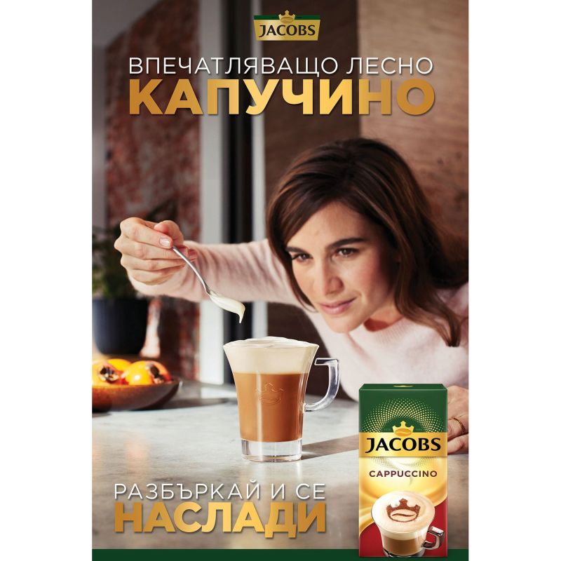 Единичните сашета са идеални за пътуване, за работа или за почивка, защото приготвянето на перфектната напитка е бързо и лесно: изсипете в чаша, налейте гореща вода, разбъркайте - и вкусното кафе вече е готово. Kапучиното на Jacobs се предлага и в практичната кутия от 115.2 g с 8 сашета от по 14.4 g всяко.
