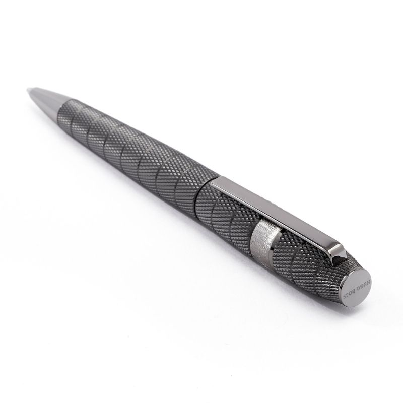 Серията пишещи средства Quantum на марката Hugo Boss се отличава със своя интересен дизайн. Балансираната й стилна форма е с дълбока, матова гравюра и бронзово покритие. Цялата повърхност е украсена с вертикални ивици, които заличават границата между горната и долната част на цевта.