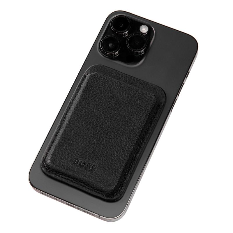 Калъф за карти с MagSafe от серията Classic Grained на Hugo Boss. Калъфът може да се залепи за всеки телефон, който разполага с MagSafe.
