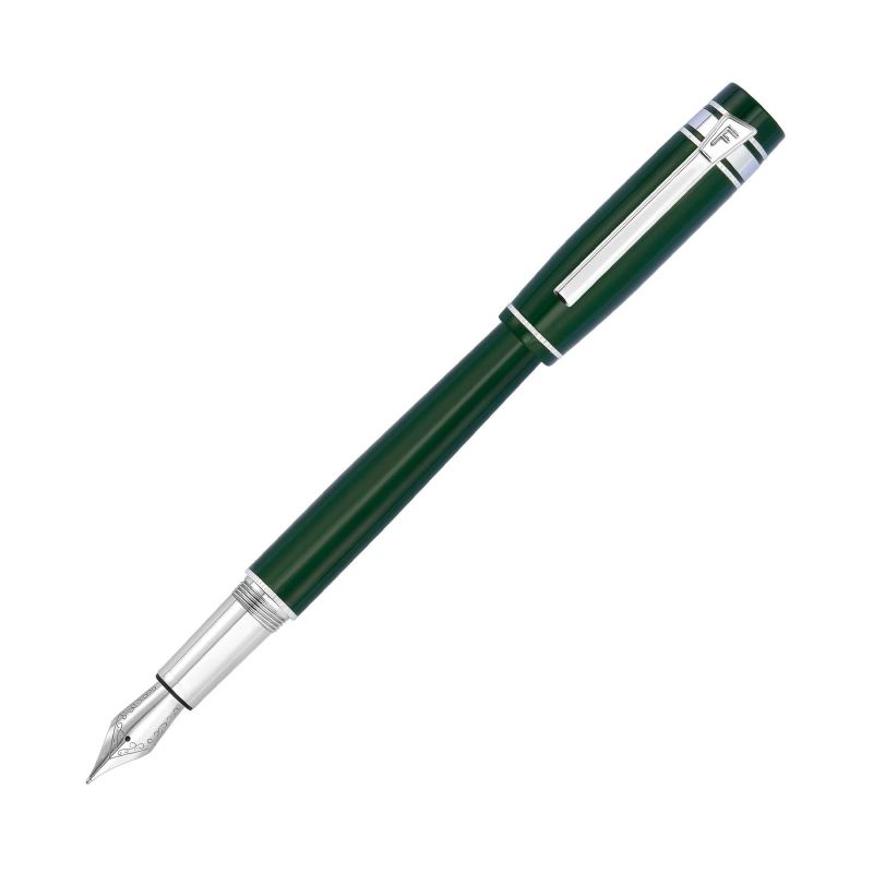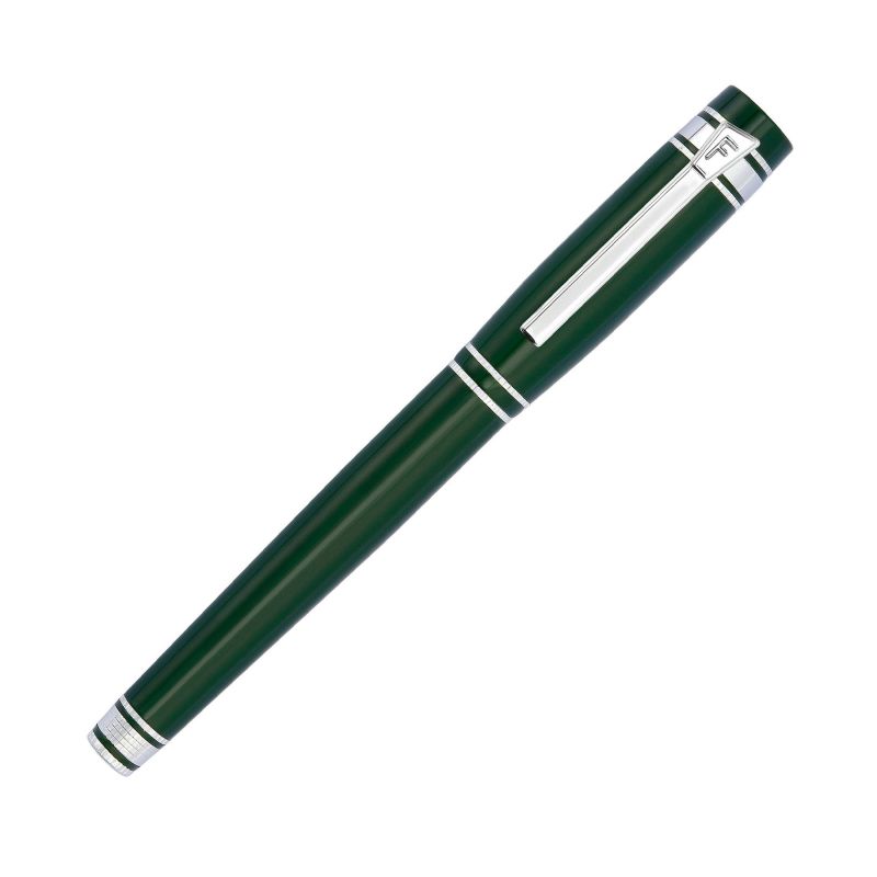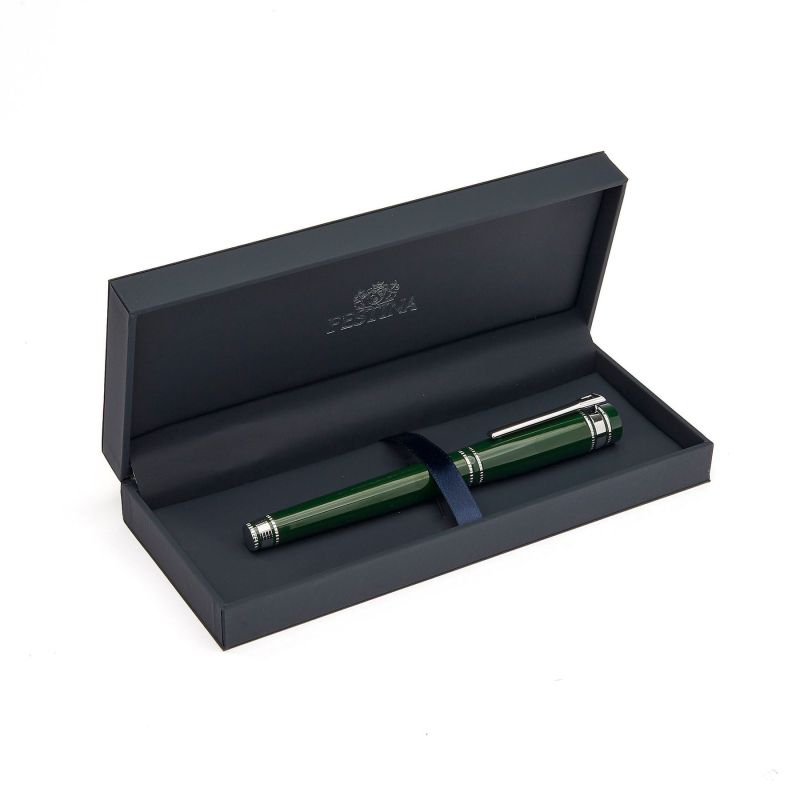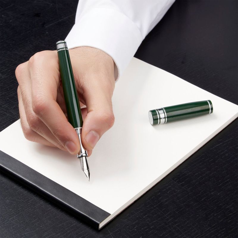 Леко уголеменият силует на писалката е завършен с лъскав лак и подсилен с хромирани акценти и детайлни гравюри.