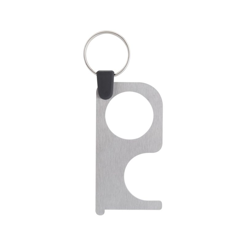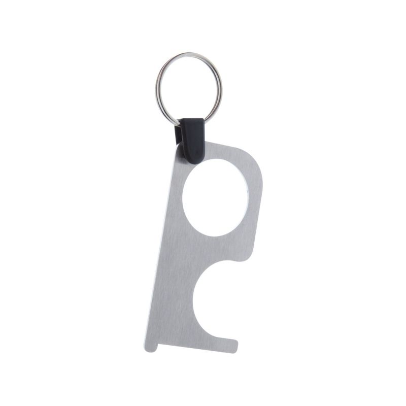 Практичен хигиенен ключодържател от неръждаема стомана, предназначен за натискане на бутони и отваряне на врати без директен контакт. Може да се използва и като ключодържател с включения метален пръстен.