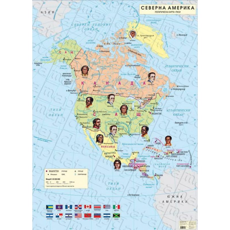 Стенна карта на Северна Америка, раси, политическа, 100 x 140 cm, ламинирана