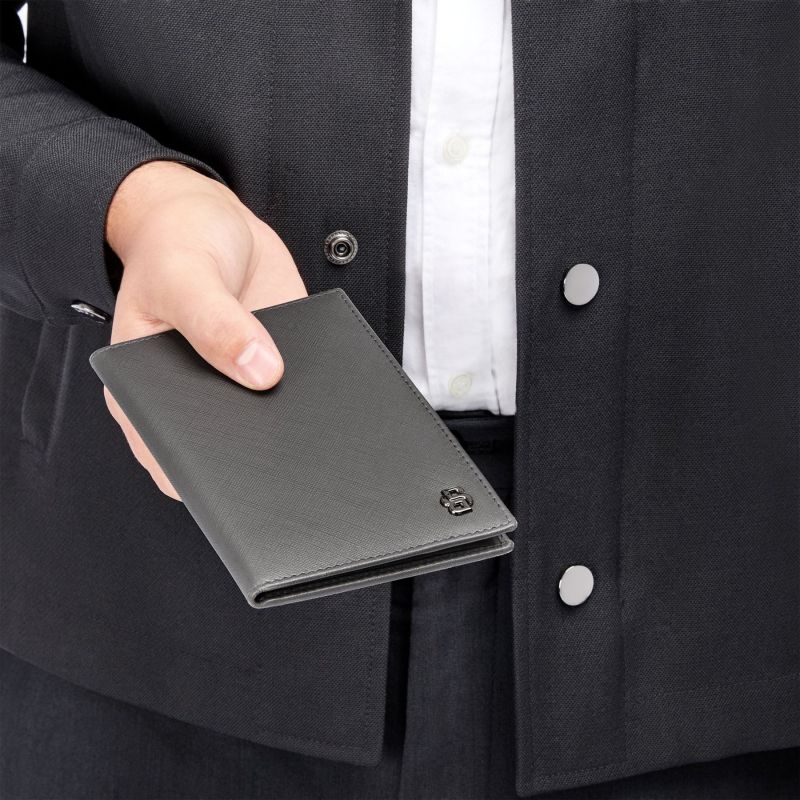 Линията Double B Saffiano е изработена от първокласна естествена кожа с фин матов сафияно релеф, който придава усещане за съвременен лукс и изтънченост. Всеки модел е прецизно конструиран и завършен с характерната метална плочка Double B в дълбоко gunmetal покритие — отличителен детайл, който подчертава модерния характер на серията. Този практичен паспортен калъф предлага внимателно организирано вътрешно пространство с отделение за паспорт, слот за банкноти и четири слота за карти, съчетавайки функционалност и минималистична елегантност.