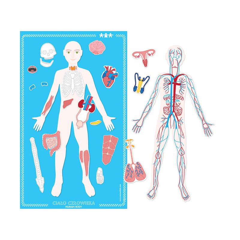 Комплектът включва: 1 голяма магнитна дъска 100 х 60 cm; 16 магнита с имена на системите на човешкото тяло (на английски и полски); 69 магнита с изображения на части от човешкото тяло; кутия, наръчник за употреба.