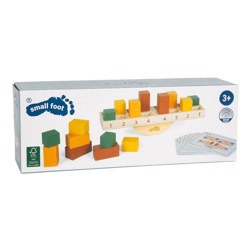 • Съдържа 16 цветни дървени блокчета с различна височина и тегло.