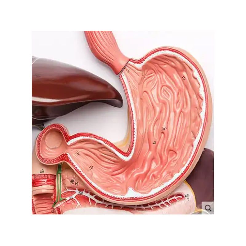 Стомахът е отворен по протежение на фронталната равнина: дуденумът, сляпото черво, част от тънките черва и ректумът са отворени, за да се разкрие вътрешността им, напречното дебело черво е подвижно.