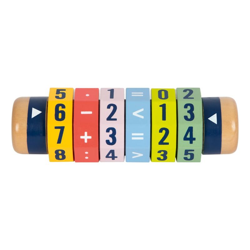 Дървеният търкалящ се калкулатор с шест въртящи се части позволява на младите математици да събират, изваждат, умножават и делят до числото 99.