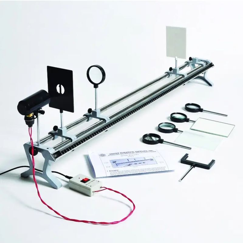 Оптичен комплект, предназначен за основни оптически експерименти – изображения чрез лещи и огледала. Елементите са монтирани в защитни рамки с монтажни пръти за лесно подравняване, а четирите захвата имат индексна маркировка и фиксиращи винтове за закрепване.