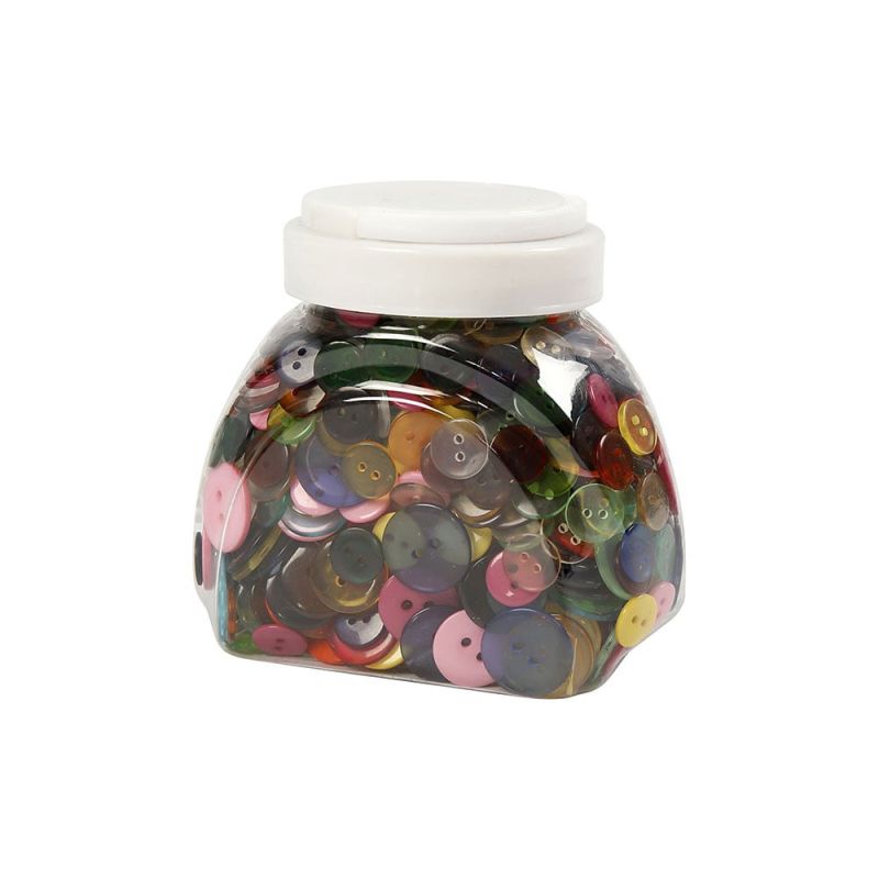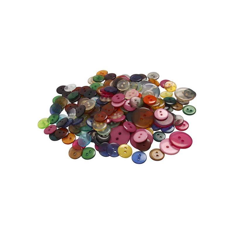 Микс от плоски кръгли пластмасови копчета с 2 дупки, в разнообразни непрозрачни и прозрачни цветове.