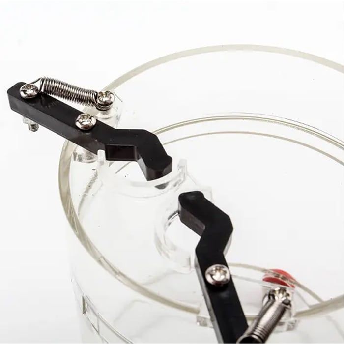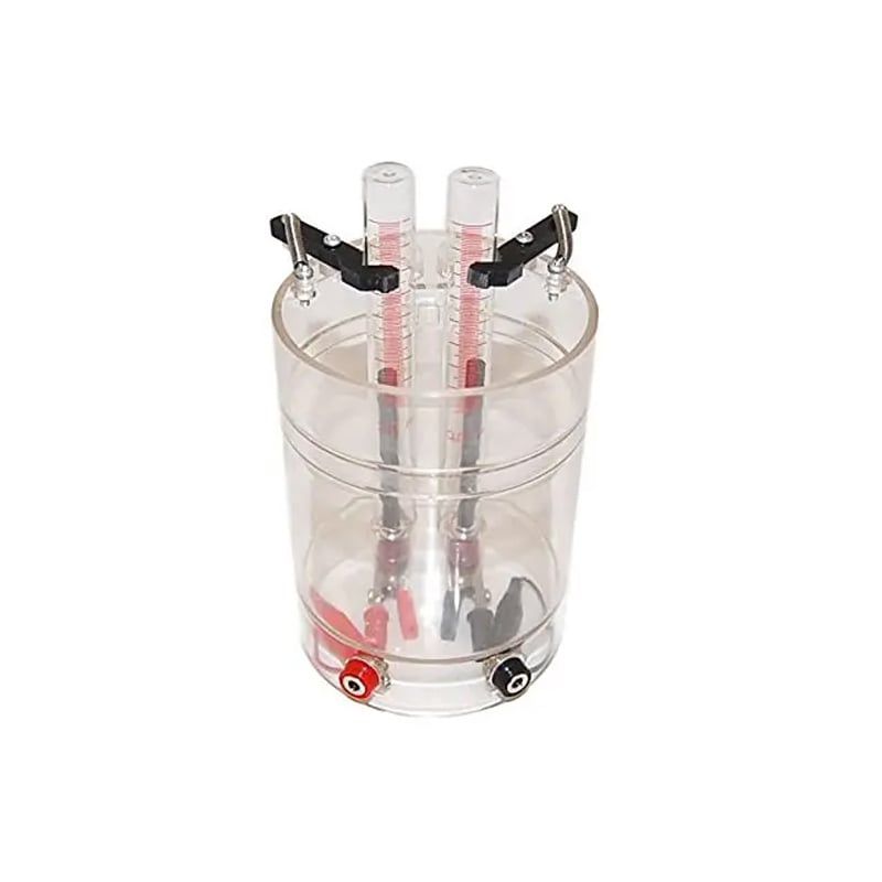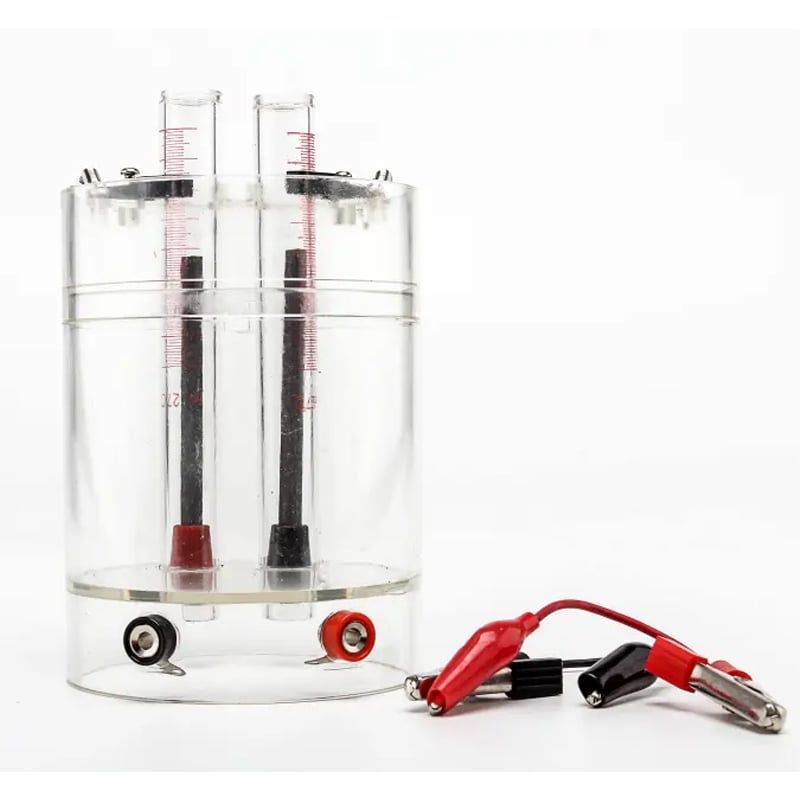 Този напълно самостоятелен воден електролизатор се доставя в комплект с въглеродни електроди, пластмасов резервоар, градуирани пластмасови епруветки и проводникови съединители за свързващи клеми или щипки на крокодил.