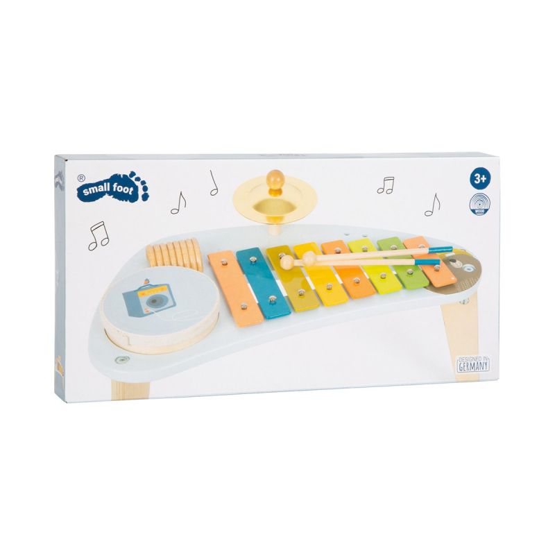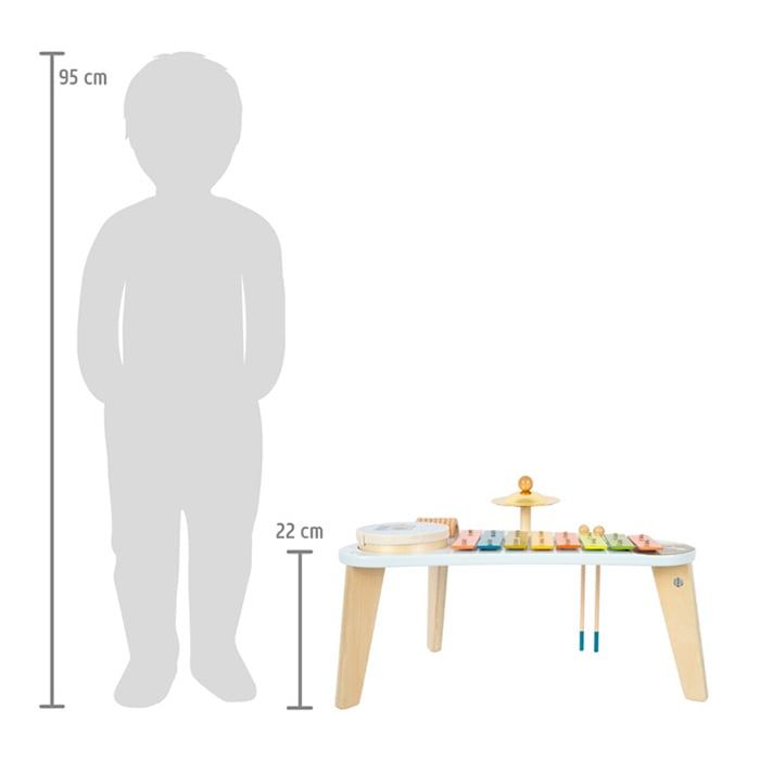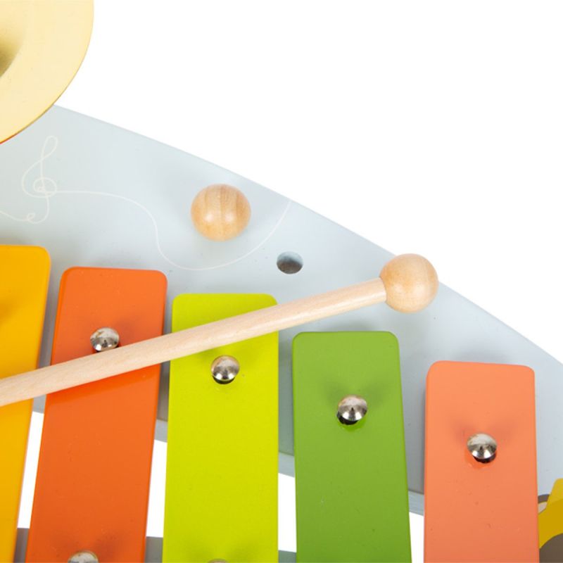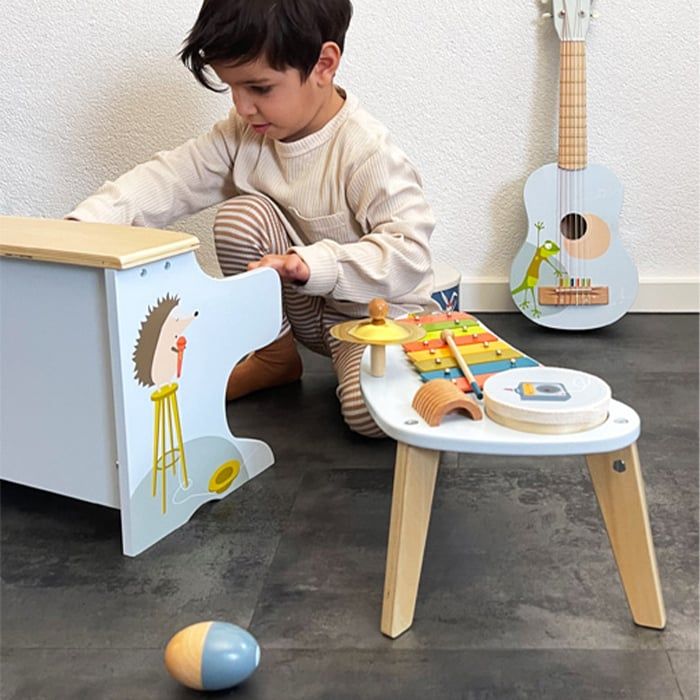 Тази здрава музикална маса стои на три крака и насърчава децата да събират разнообразни преживявания със звук, благодарение на чинелите, ксилофона, дрънкалката и подвижния барабан.