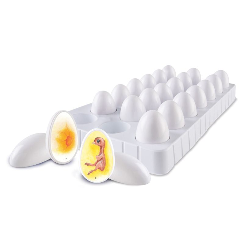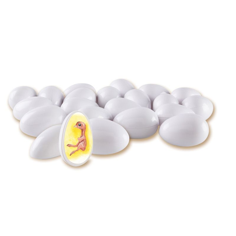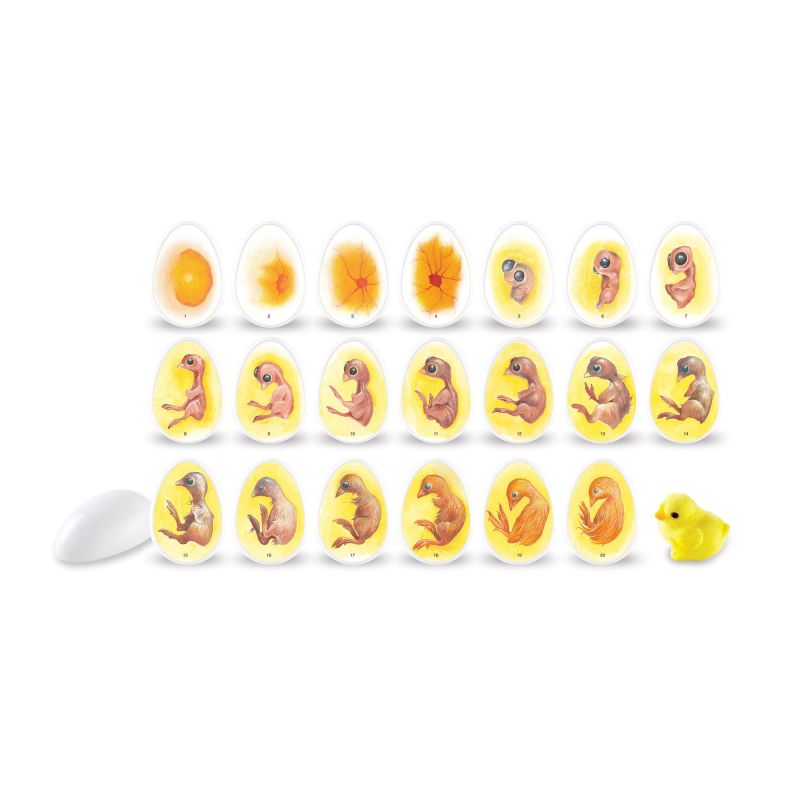 Учениците могат да видят ежедневното развитие на пилето чрез отваряне на тези реалистично илюстрирани яйца.Ръководството включва определения, факти за пилетата и фотокопирен лист за етикети. Яйцата и таблата за съхранение са етикетирани за самопроверка и лесно организиране. Не се изисква инкубатор. Размерът на яйцата е 7 сm. Възраст: 5 – 9 години. Може да видите ръководството за употреба тук.