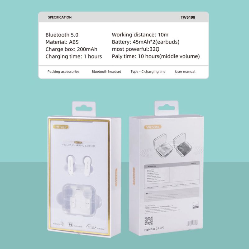 Wesdar Слушалки TWS198 , безжични, с Bluetooth, със зареждащ кейс, черни