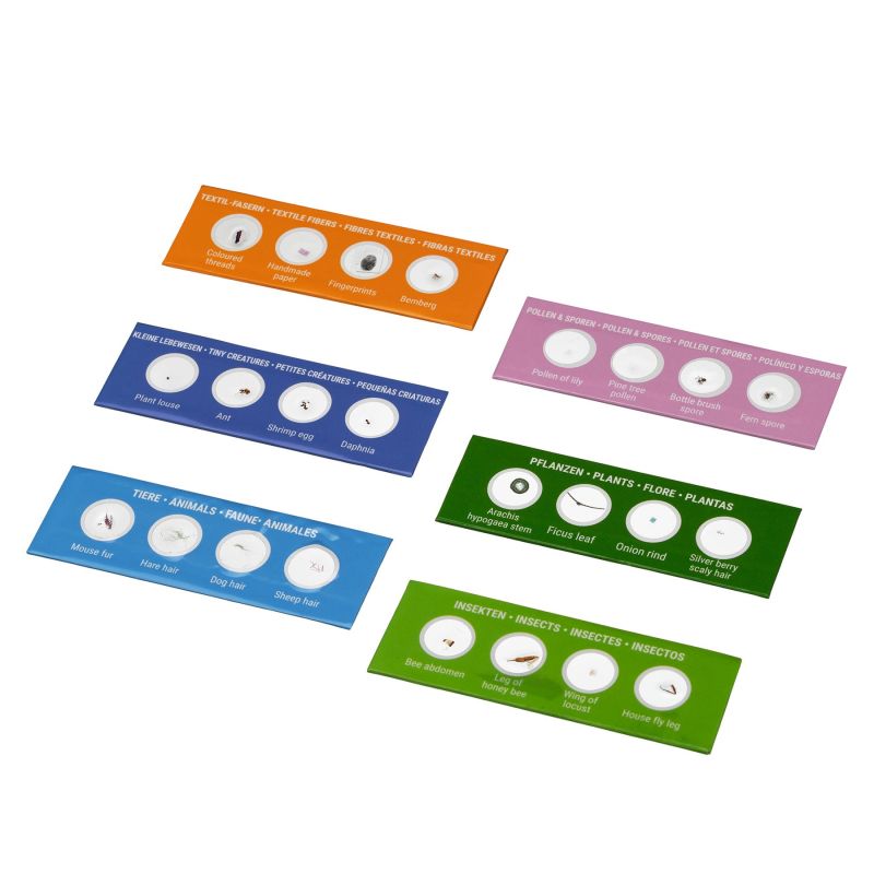 Съдържа: 6 предметни стъкла за микроскоп с общо 24 различни препарата: