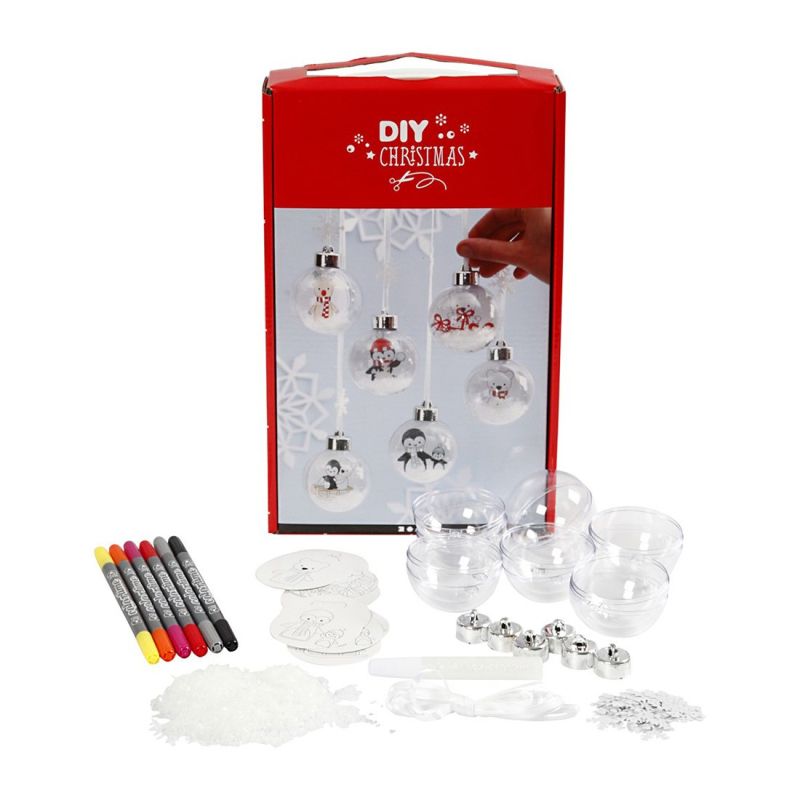 Комплектът включва всички материали, необходими за направата на 6 уникални висящи акрилни топки от две части. Включва коледни мотиви за декорация, които се оцветяват и отделят.