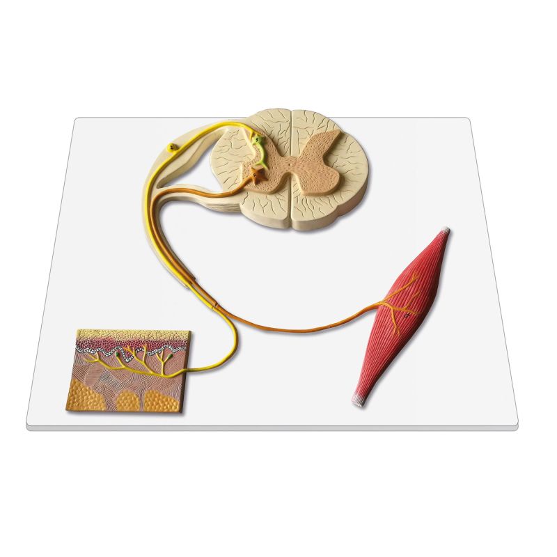 Моделът показва работата на рецептора, сензорния неврон, моторния неврон и ефектора.