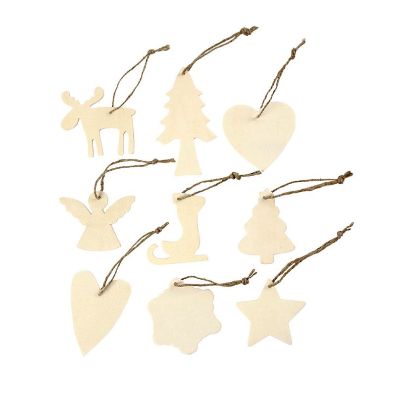 Коледни орнаменти от светло дърво с окачена връв и дървено мънисто.Размери: 7–8 cm.