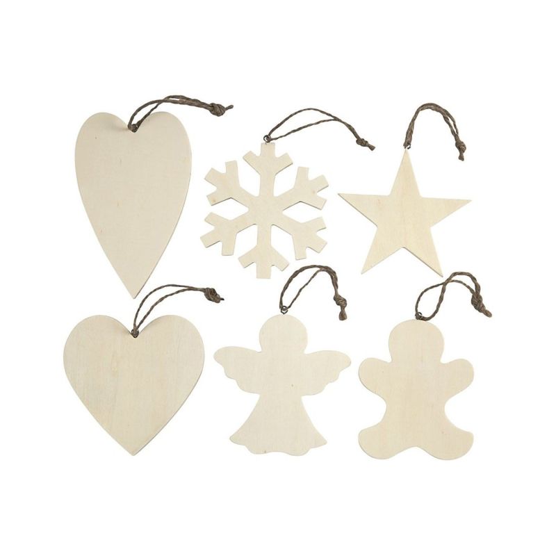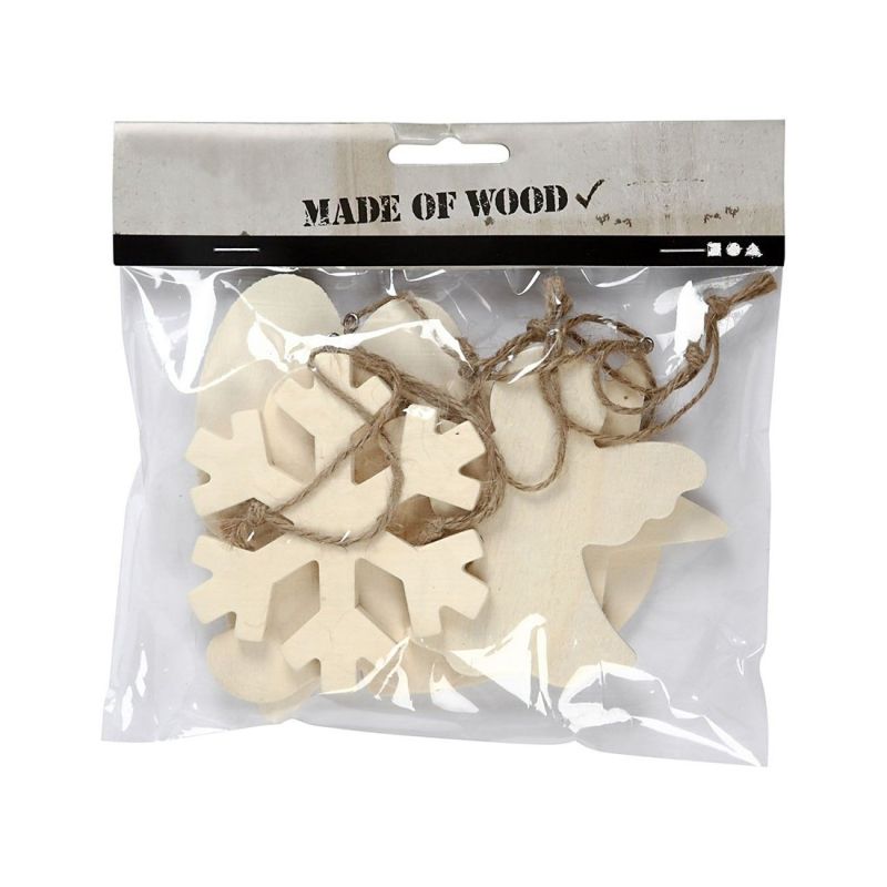 Комплектът включва орнаменти за декорация, изработени от светло дърво в 6 различни дизайна.6 броя в опаковка.
