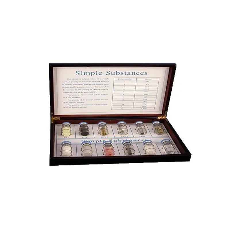 Съдържа 12 проби: сяра, въглерод, мед, алуминий, цинк, желязо, олово, магнезий, калций, бензен, кристален йод, силициев диоксид.