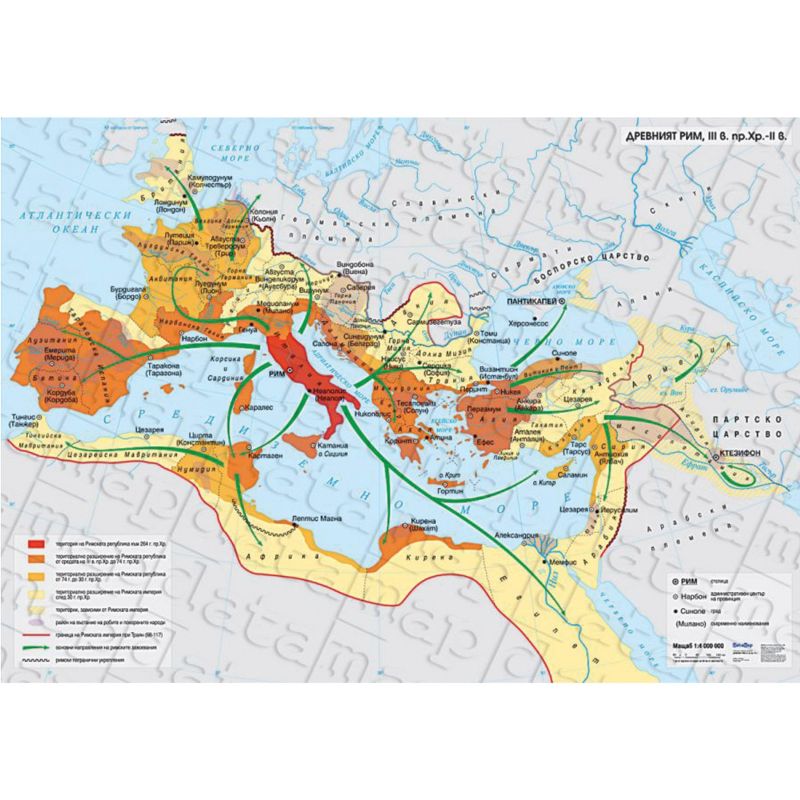 Карта древен Рим, изобразяваща географска мрежа; хидрография; територия на Римската република през 264 г. пр.Хр., териториални разширения на Римската република, териториално разширение на Римската империя след 30 г. пр.Хр., територии зависими от Римската империя, райони където робите и покорените народи са въставали; граница на Римската империя при Траян; основни направления на римските завоевания; римски погранични укрепления; столици, административни центрове на провинции и градове; надписи на хидрография, историко-географски области, племена и други. Легенда. Издание 2008 г. Размери: 140 x 100 cm. Двустранно ламинирана Тегло: 0.583 kg.