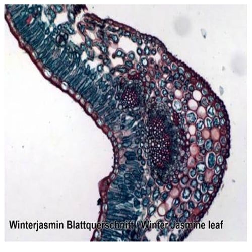 - Лист от зимен жасмин (Leaf of Winter Jasmine), напречен разрез (C.S.);
