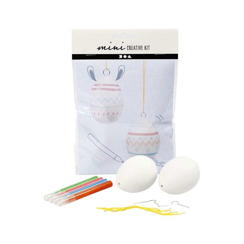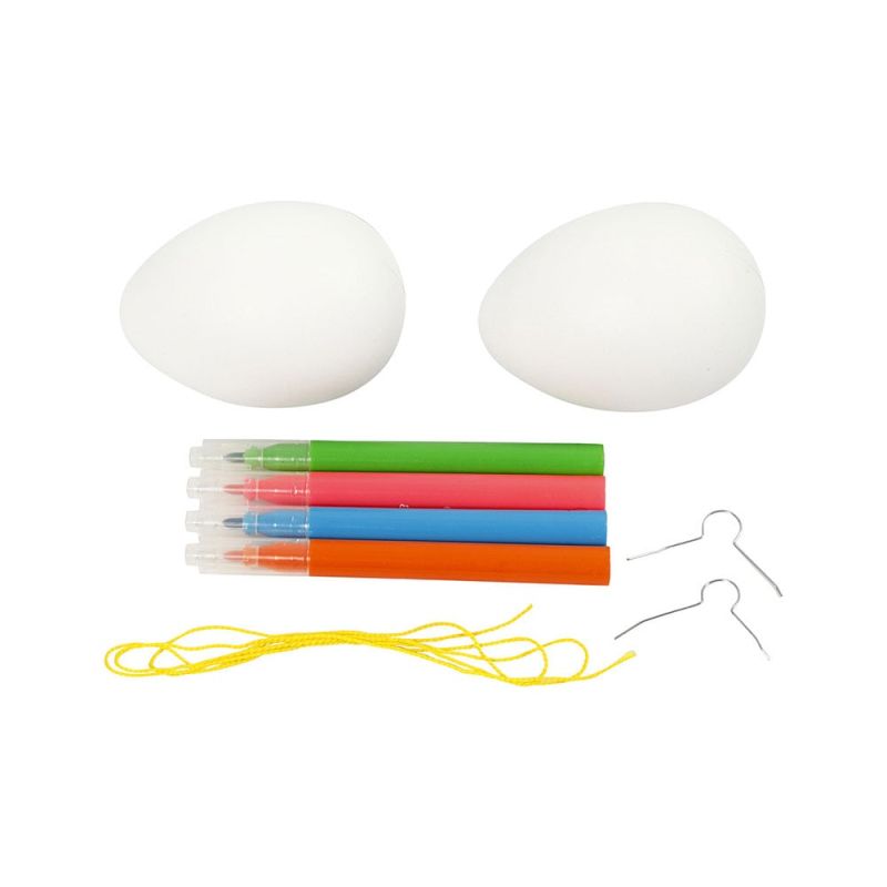 Комплект материали за декорация на бели пластмасови яйца с включени маркери.