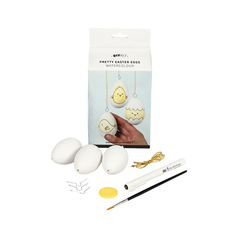 Комплект материали за декорация за пилета върху 3 пластмасови яйца, украсени с акварелна боя на водна основа.