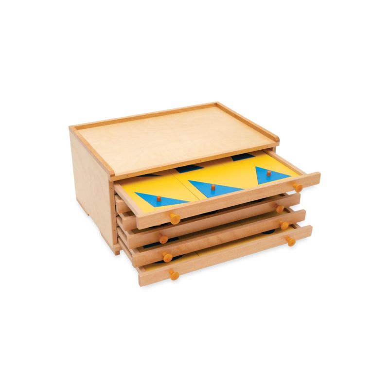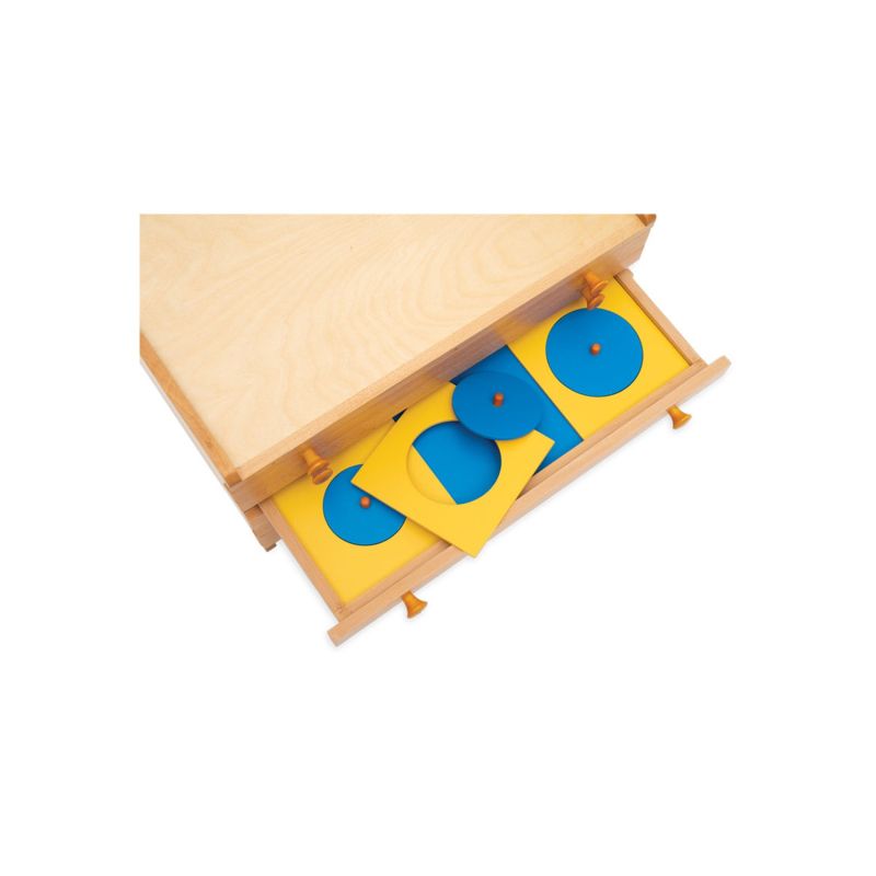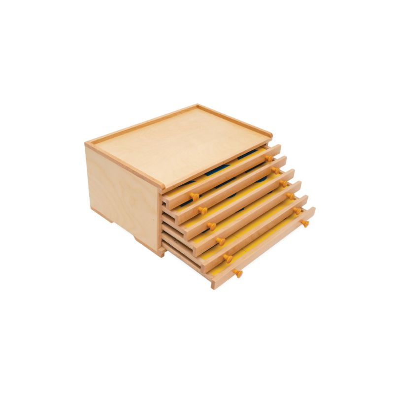 Дървен шкаф с 6 чекмеджета за съхранение на плоски геометрични фигури. Комплектът запознава децата със света на геометрията.