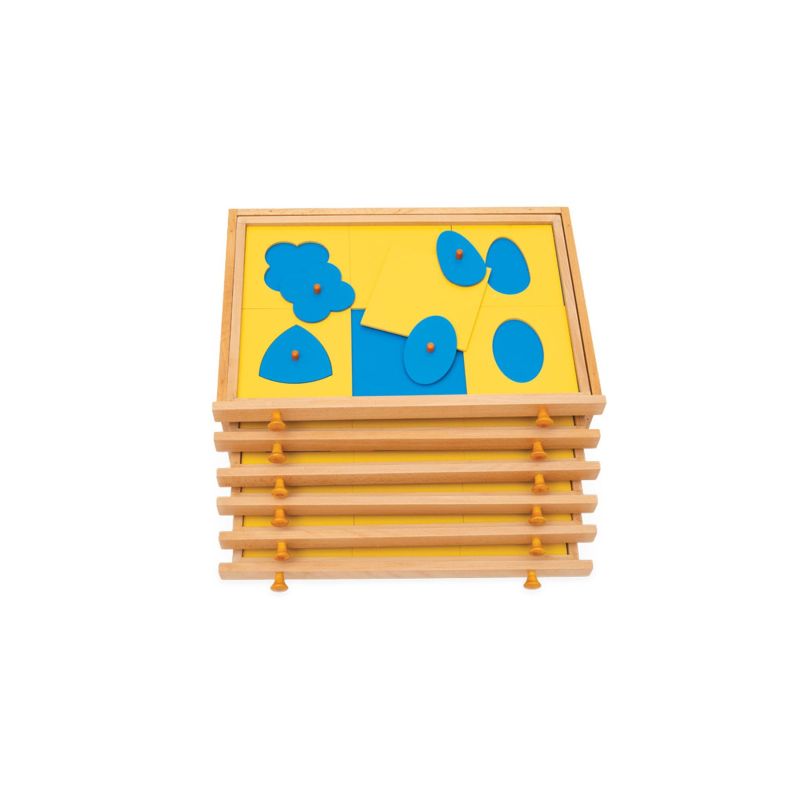 Дървен шкаф с 6 чекмеджета, съхраняващи плоски геометрични фигури.