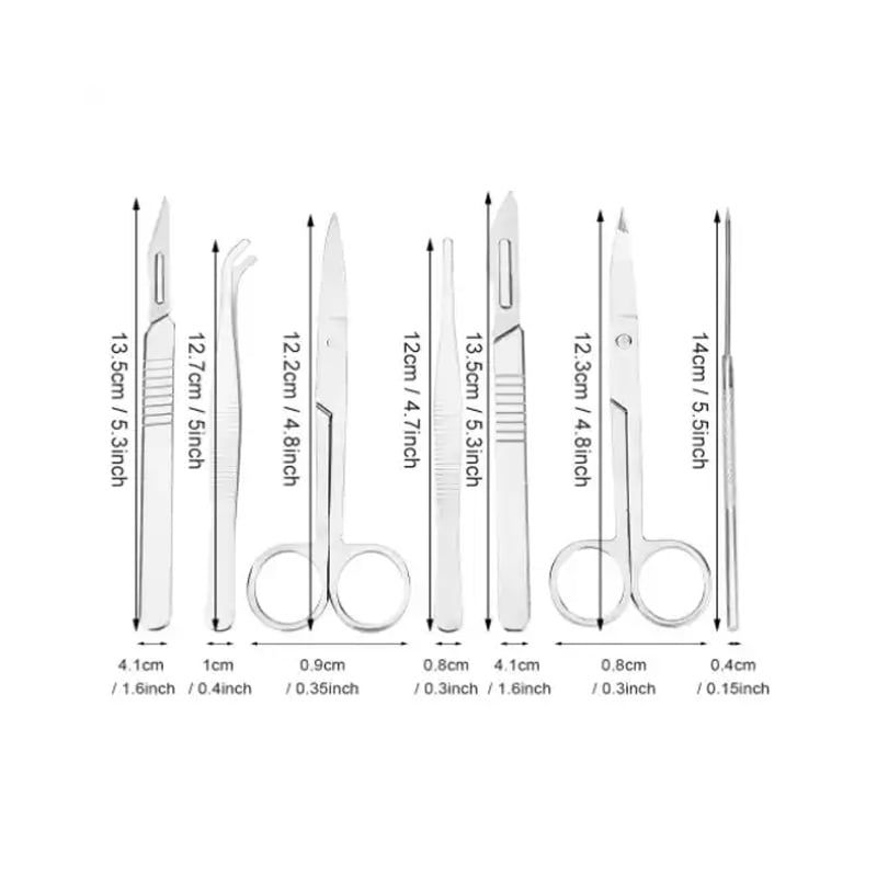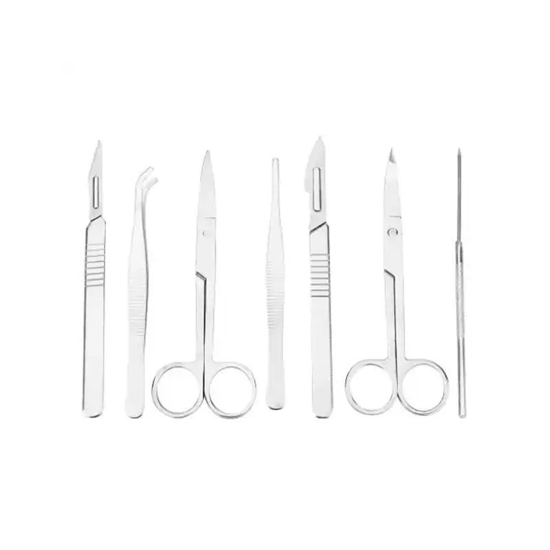 Включва: игла за дисекция, ножица за дисекция и пинсета.