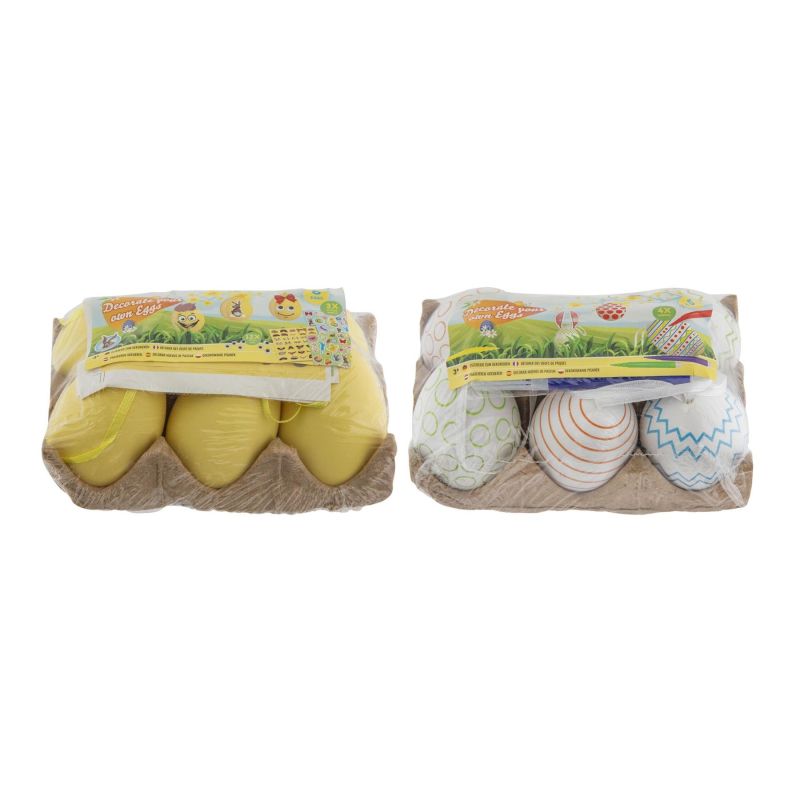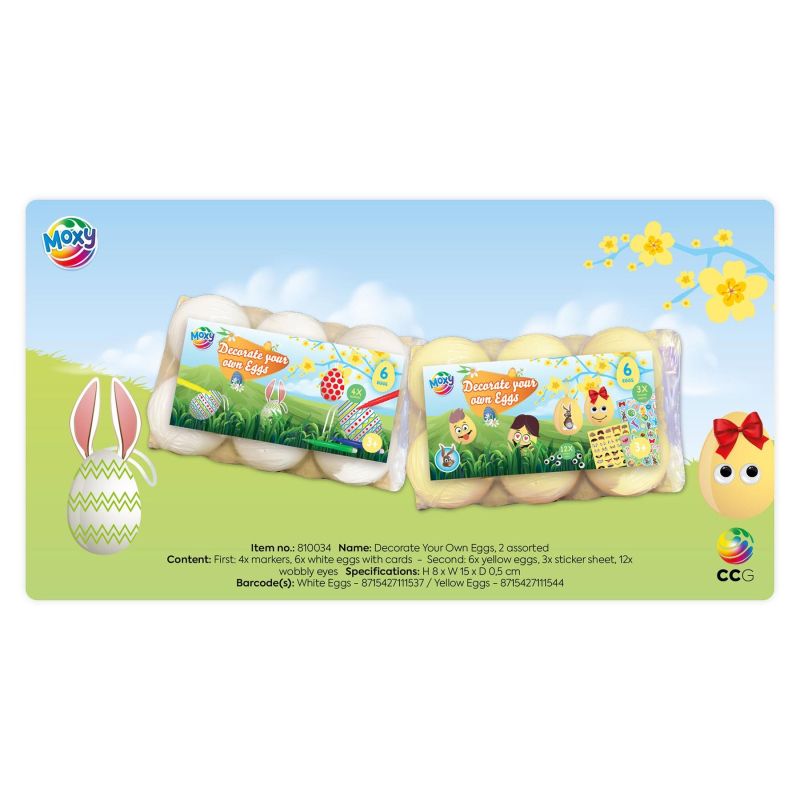 - Moxy Яйца за декорация, жълти, 6 броя, с включени стикери и очички - 24 опаковки. Подходящи са за деца над 3-годишна възраст.