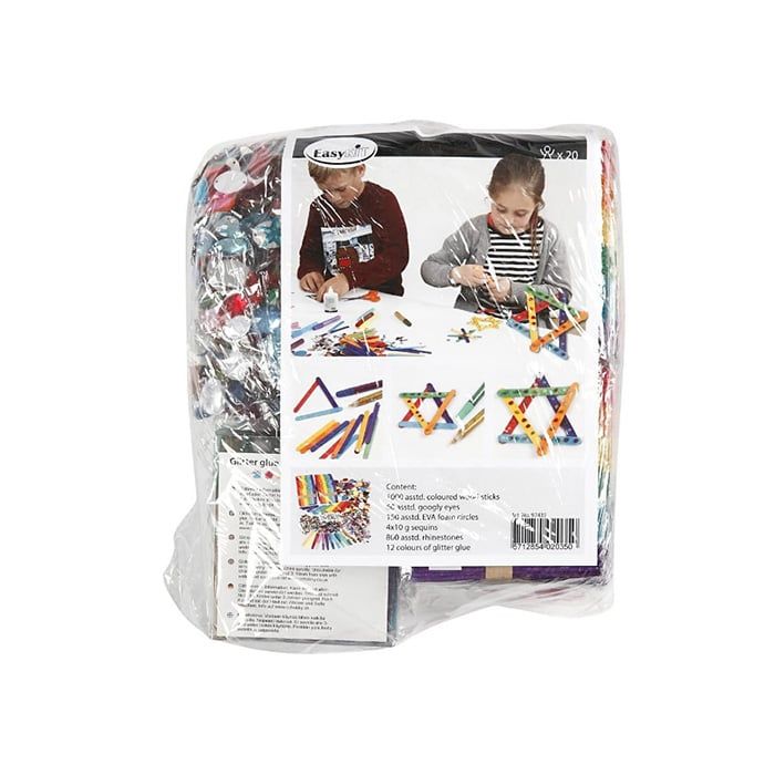 Комплект с материали за красиви и цветни орнаменти с дървени пръчки, мърдащи очички, мъниста и пайети – достатъчни за минимум 20 деца.Съдържание: 1000 броя цветни дървени пръчки, 60 броя мърдащи очички, 150 кръгчета от пяна, 4 x 10 g пайети, 800 броя мъниста и 12 цвята от брокатено лепило.